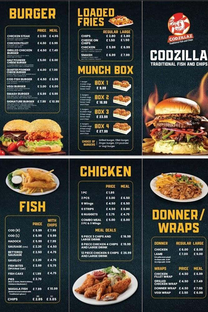 Codzillaz offers a broad menu with something for every craving. The fish and chips come in various sizes, including regular and large cod options, and they are always freshly prepared, ensuring a delightful crunch and flaky interior that many diners love.