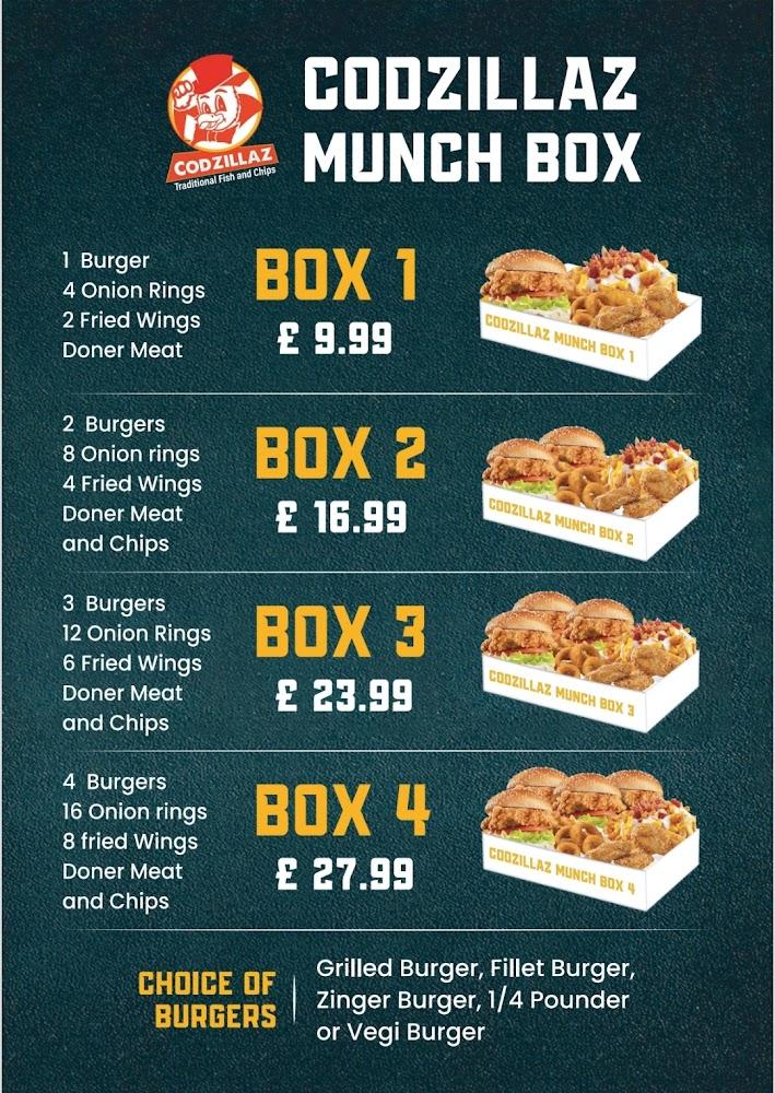 Not to overlook the kebabs, wraps, and even a kids menu that caters to younger taste buds, Codzillaz undoubtedly aims to satisfy every taste and preference. Pair your meal with regular or cheesy chips to complete your experience.